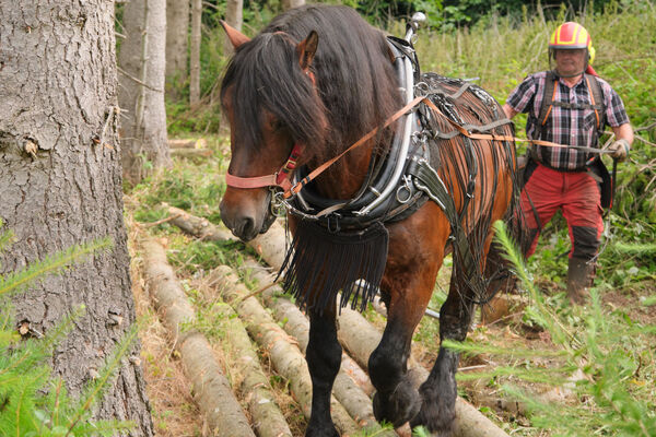 Bei der Holzernte verbinde ich in meinem Forst die traditionelle Arbeit mit Rückepferden mit der Arbeit moderner Maschinen. Dies ist besonders schonend für den Wald.